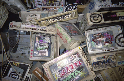 2000 - Old technology in the East Village internet café back room. New York, NY.